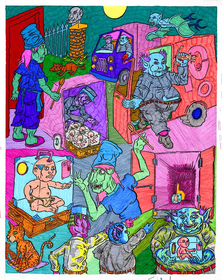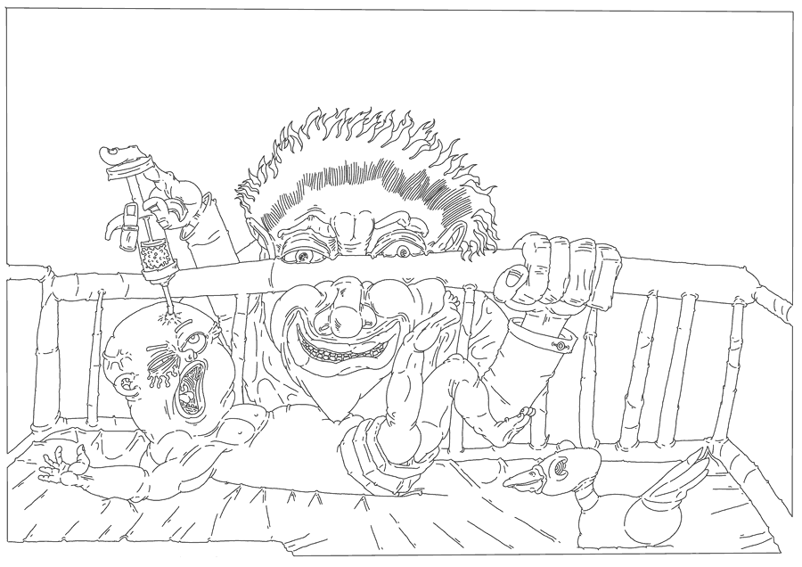 Smiling maniacally he burst into the baby ward where the 7 babies of the fisherwoman lay.