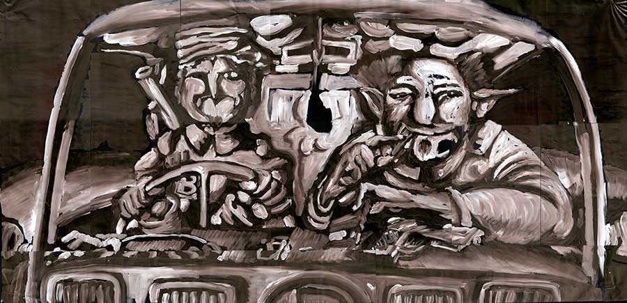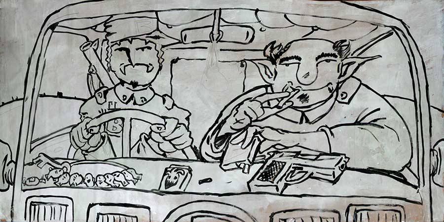 There are two people in the truck. The light of the stars made their features stretchy and pale. They drive on a highway on the globe. The driver is a thin tall man. He was uncomfortable in his chair because he was too long. The other was a fat big man. They have been working for years at the same catering company that supplies a number of restaurants on the globe with stock. The driver tries to talk about what he thought where philosophical thoughts. He usually started these conversations with the sentence: