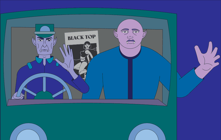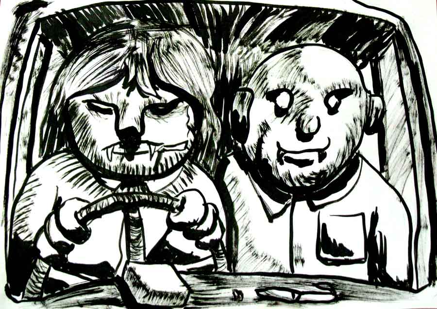 The co-driver put his finger on the bat vampire and gave him a push to see if he was really dead. That appeared to be true. He opened the side window of the truck and grabbed it. He pulled it out of the hole in the windshield and through the side window. He closed the side window and put his razor-sharp teeth into the flesh of the bat vampire. The driver looked at him in disgust. The co-driver said with his mouth full of bloody meat: "I'm hungry".