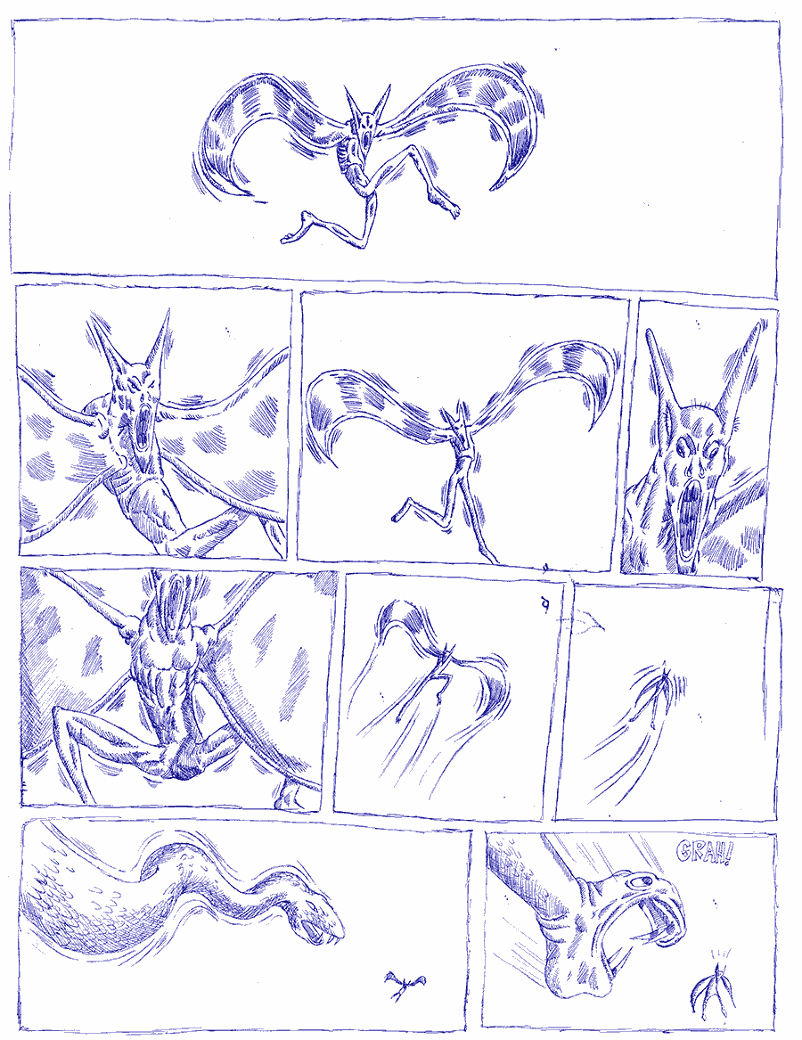 The bat vampire is suddenly attacked by 9 floating snake fish attacking with a fierceness and venom that you could hardly imagine. It was a wild madness of hatred and bloodlust.