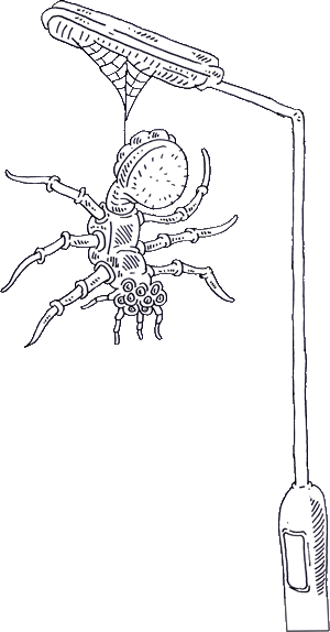 A frightening big spider. hanging on a lamp post: