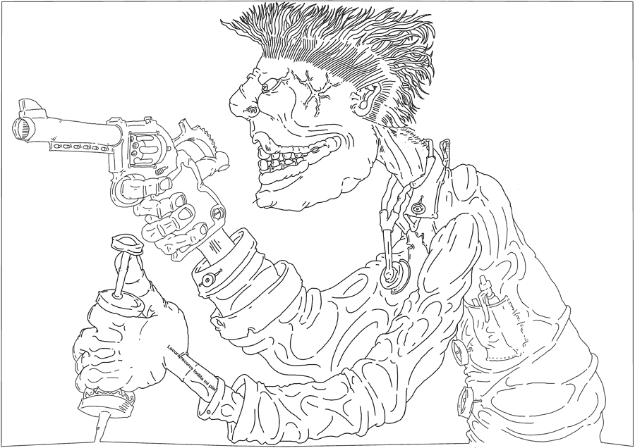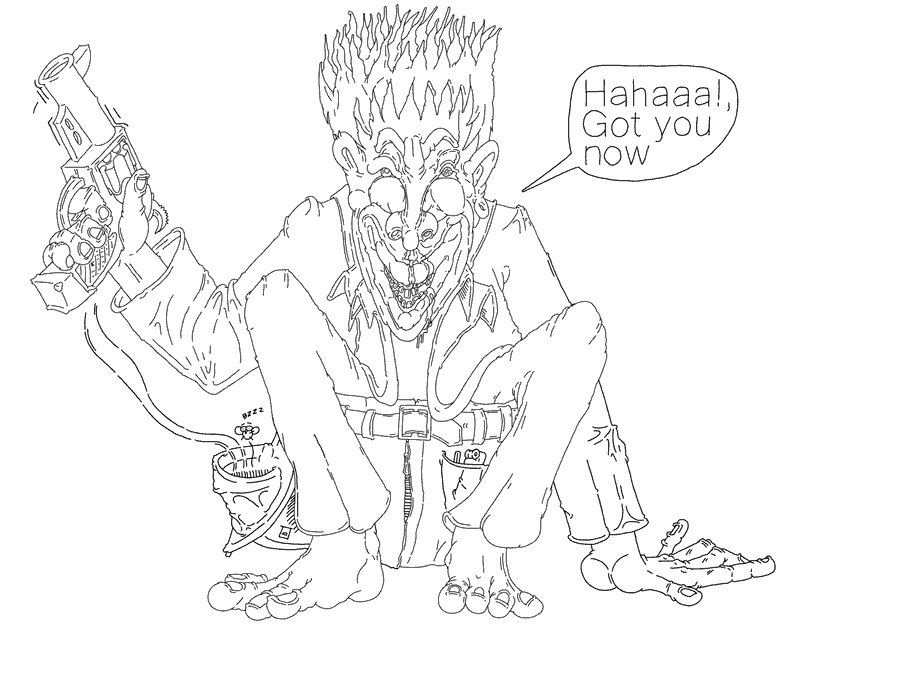 The first of which was a man with green peak hair who ran into the hospital entrance with a revolver in his hand and syringes in his pockets. He was tall, thin, and moved like a cross between Groucho Marx and a flamingo. This was Harlequin He burst into the hospital like a crazy crazy maniacally smiling maniac.