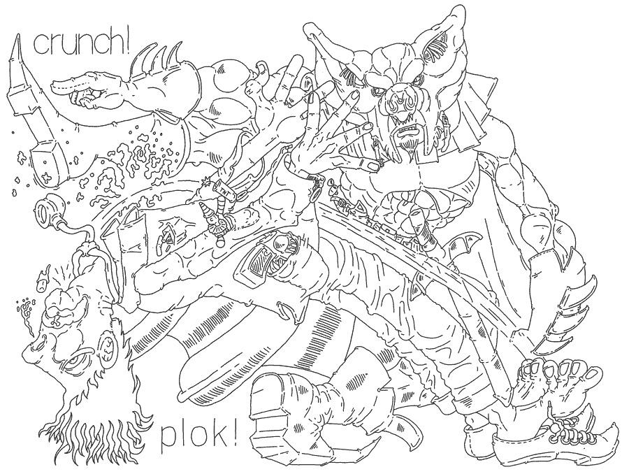 At that moment, the car of the two catering employees just drove under the fight in the air. There was still a deep heavy silence in the truck. It was brutally disrupted. The bat vampire fell straight down and banged the windshield. The co-driver was shocked when a batwing rat struck his van. Half dead and in a bloody star of safety glass. The driver was again rescued by his superior control over senses, muscles and stress. Their load was worth a great deal, he did not want to tell his boss that it was lost. ..." Fortunately they were almost at the restaurant.