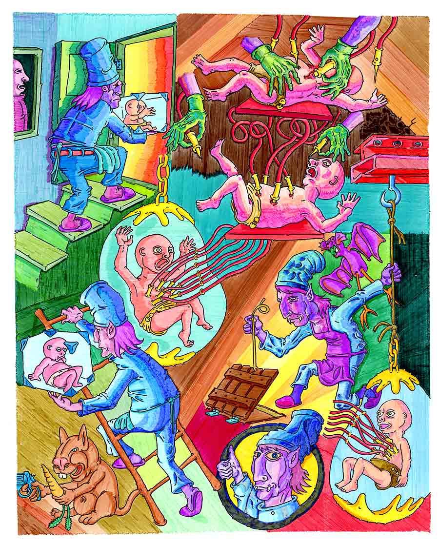 The baby is hooked up to a special machine which slowly will bleed it dry. The blood of a baby of this special blood type is considered a delicacy among the vampires living on the globe.