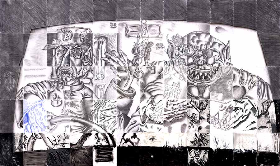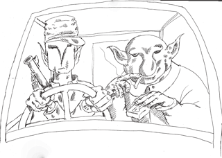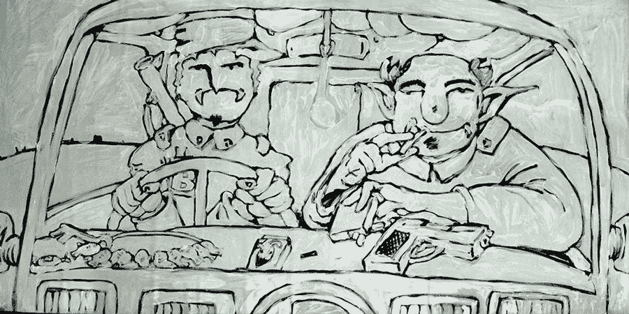The co-driver put his finger on the bat vampire and gave him a push to see if he was really dead. That appeared to be true. He opened the side window of the truck and grabbed it. He pulled it out of the hole in the windshield and through the side window. He closed the side window and put his razor-sharp teeth into the flesh of the bat vampire. The driver looked at him in disgust. The co-driver said with his mouth full of bloody meat: "I'm hungry".