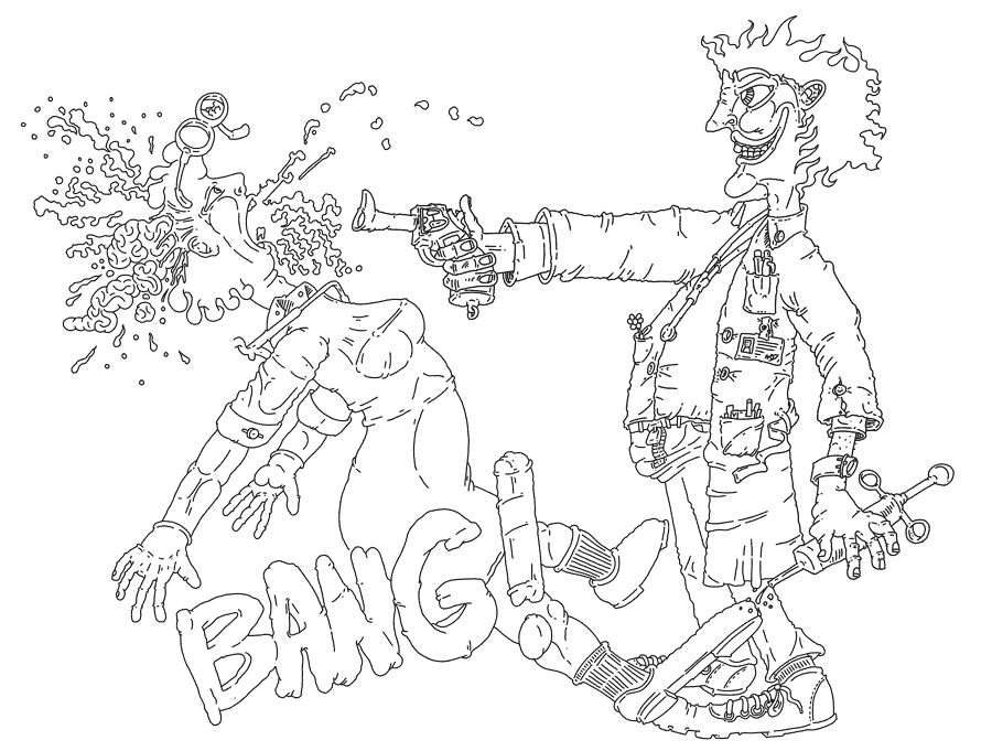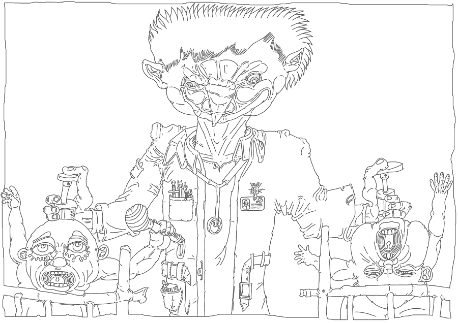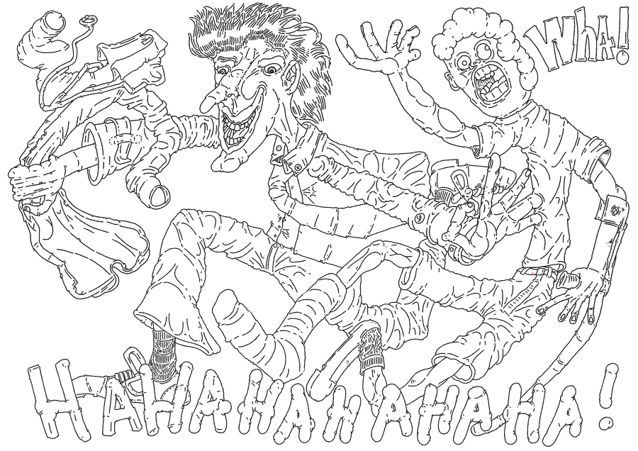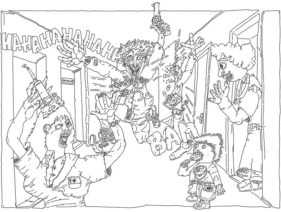 The first of which was a man with green peak hair who ran into the hospital entrance with a revolver in his hand and syringes in his pockets. He was tall, thin, and moved like a cross between Groucho Marx and a flamingo. This was Harlequin He burst into the hospital like a crazy crazy maniacally smiling maniac.