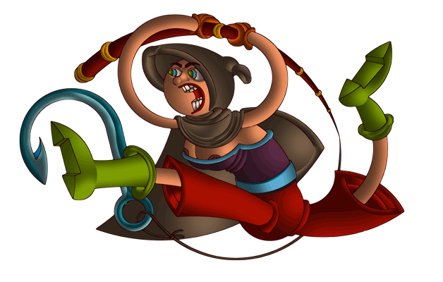 Before longbeard got the chance to respond to the orders of the fish gods, they disappeared below sea level. The fisherwoman had arrived. She wanted revenge on the fish gods. She had thrown her fish hook in the middle of the school of fish gods when they were talking to Langbaard and they were shocked when that happened. The fisherwoman was so big that she could stand in the ocean and she came running through the water in the direction of Longbaard's ship to see if she had caught something. She was disappointed when she saw that was not the case and wanted to turn around to continue on her revenge mission when she saw langbaard's ship. She ducked under water and approached his ship unseen. Longbeard himself was very surprised at the sudden disappearance of the gods. "Maybe it's something I said, what do you think Archibald?" Archibald the parrot was too scared to answer because he saw the gigantic face of the fisherman on port side. Langbaard turned to see what the problem was and was so frightened that he kicked Archibald promptly overboard.Longbeard did not notice this. Archibald sank in the depths of the ocean. Long beard had other concerns at that time. "Who are you?" he asked.